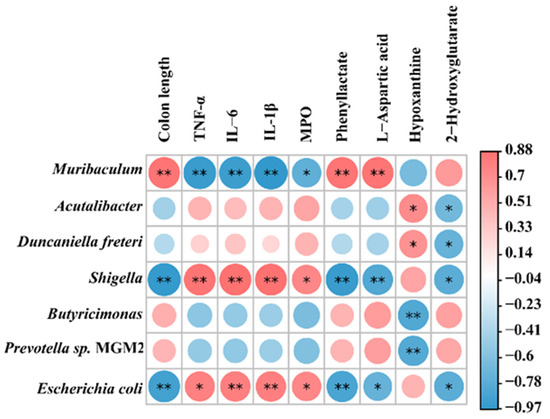 We performed Spearman correlation analyses of colitis symptom parameters, microbiological results, and metabolite outcomes. The results were illustrated in Figure 9, which showed that the beneficial bacterium Muribaculum was positively correlated with colon length, as well as with the metabolites phenyllactate and L-aspartic acid. Conversely, it exhibited a negative correlation with MPO activity and pro-inflammatory factors, including IL-1β, IL-6, and TNF-α. In contrast, the harmful bacteria Shigella and Escherichia coli displayed results opposite to those of Muribaculum. In addition, when analyzing the correlation results concerning metabolites, hypoxanthine was positively correlated with Acutalibacter and Duncaniella freteri, while it was negatively correlated with Butyricimonas and Prevotella sp. MGM2. Additionally, 2-hydroxyglutarate demonstrated an antagonistic relationship with all the harmful bacteria identified in our results. These findings suggested that the harmful bacteria exhibited an antagonistic relationship, and as noted earlier, the alterations in gut flora and their metabolites may further elucidate the mechanisms by which SCH ameliorated DSS-induced colitis in mice.