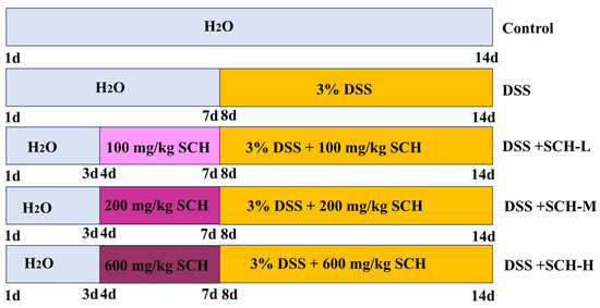 Subsequently, the 45 mice were divided into five groups, each consisting of nine mice: control, DSS, SCH low-dose (SCH-L), SCH medium-dose (SCH-M), and SCH high-dose (SCH-H). Oral doses of 100, 200, and 600 mg/kg were administered to the experimental groups over the course of the 14-day experiment (Figure 10). DSS was introduced into the drinking water to induce colitis and evaluate the impact of different SCH dosages on the condition.