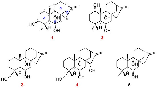 Diterpenoids, a class of secondary metabolites, are comprised of four isoprene units with twenty carbons. Such diterpenoids are classified as labdanes, pimaranes, kauranes, trachylobane, and so on, depending on the type of cyclization and the number of rings [1,2]. Among diterpenoids, kauranes are tetracyclic diterpenes with four carbon ring moieties [3]. Their structural scaffolds typically consist of a perhydrophenantrene moiety with rings A, B, as well as C (Figure 1), and a cyclopentane moiety with ring D, which is fused at the C-8 and C-13 positions [2]. Depending on the inversion of stereocenters, enantiomers are distinguished into two types, kauranes and ent-kauranes. The majority of enantiomers belong to ent-kauranes and generally, they have negative values of optical rotation [2]. Most kaurane diterpenoids are discovered in plant sources such as the Lamiaceae family, as well as Asteraceae, Annonaceae, and Euphorbiaceae [3,4]. They are known to be involved in the protective functions of plants that produce them [5,6]. Additionally, their broad biological activities have been reported, including antiparasitic, antifungal, antibacterial, antitumor, anti-inflammatory, and antiviral activities in previous research [4,7,8,9,10,11,12].