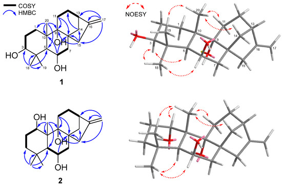 Key COSY, HMBC, and NOESY correlations of compounds 1 and 2.