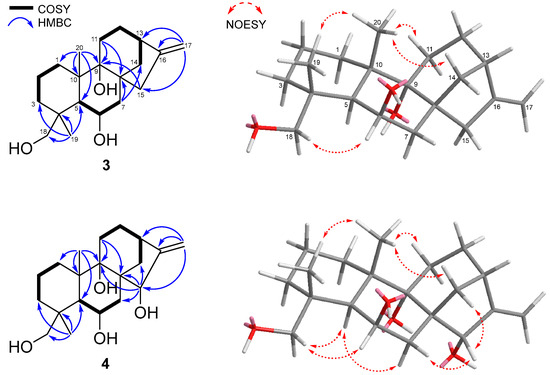Key COSY, HMBC, and NOESY correlations of compounds 3 and 4.