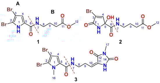 Compound 3 (Figure 1) was purified and obtained as a yellowish powder with the molecular formula C13H14Br2N4O3, as indicated by the (+)-HRESIMS ion peak at m/z 454.9327 [M + Na]+, which suggests the presence of eight degrees of unsaturation. The detection of three ion peaks at m/z 454.9, 456.9, and 458.9 in a 1:2:1 ratio further corroborates the dibrominated nature of compound 3. The structure for compound 3 was determined through analysis of its 1D (1H and 13C) and 2D (COSY, HSQC, HMBC, and NOESY) NMR spectra. The NMR data (Table 1) supports the presence of two substructures (A and B). Except for the absence of the NH-1 signal, compound 3 exhibited similar 1H and 13C NMR signals to the substructure A of compound 1. Notably, the 1H/13C NMR signals at 3.90 (3H, s, H3-16)/36.4 (CH3, C-16) in the 1H and 13C NMR spectra of compound 3, along with the HMBC correlations (Figure 2) from H3-16 (δH = 3.90) to C-2 (δC = 111.9) and C-5 (δC = 129.4), and from H-4 (δH = 6.24) to C-2, C-5, and C-6 (δC = 161.4), support the assignment of substructure A as the 4,5-dibromo-1-methyl-1H-pyrrole-2-carboxamide moiety.