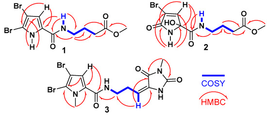 Compound 1 (Figure 1) was isolated as a yellowish powder with the molecular formula C10H12Br2N2O3, determined from the (+)-HRESIMS ion peak at m/z 388.9111 [M + Na]+. The presence of two bromine atoms in compound 1 was confirmed by the observation of three ion peaks at m/z 388.9, 390.9, and 392.9 in a 1:2:1 ratio. The structure of 1 was elucidated through the interpretation of its 1D and 2D NMR spectra. The 13C NMR spectrum showed signals for 10 carbon atoms (Table 1). Analysis of the 13C NMR spectrum, supported by the HSQC experiment, led to the assignment of five non-protonated carbons, one methine, three methylene groups, and one methyl group. The 13C NMR chemical shifts suggested the presence of two distinct parts (A and B) in compound 1, including a 4,5-dibromo-2-carboxylic acid moiety (A) linked to a 4-amino-1-methylbutanoate (B) unit via an amidic linkage (CO-NH) at C-6/NH-7. The 13C NMR spectrum exhibited two carbonyl signals at δC 159.4 and 173.6, which were attributed to carboxamide (C-6) and carboxylic acid ester (C-11) groups, respectively. The 1H/13C signals at δH/C 12.65 (s) (NH-1), 104.9 (C, C-2), 98.2 (C, C-3), 6.90 (s)/112.9 (CH, C-4), and 128.6 (C, C-5) were consistent with the structure of an amidic derivative of 4,5-dibromo-pyrrole-2-carboxylic acid (substructure A).