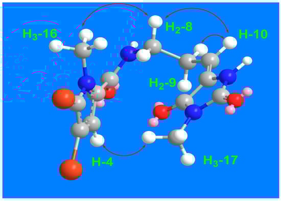 The remaining signals for compound 3 were attributed to the 5-(3-aminopropylidene)-3-methylimidazolidine-2,4-dione moiety, based on the 1H and 13C NMR signals at δH/C 3.45 (t, J = 7.5 Hz)/39.2 (CH2, C-8), 2.61 (q, J = 7.5 Hz)/28.8 (CH2, C-9), 6.24 (q, J = 7.5 Hz)/120.5 (CH, C-10), 130.0 (C, C-11), 163.1 (C, C-12), 154.0 (C, C-14), and 3.20 (3H, s, H3-17)/26.5 (CH3, C-17). This assignment is further validated by the COSY correlations (Figure 2) from H2-8 to H-10 and the HMBC correlations (Figure 2) from H-10 to C-8 (δC = 39.2), C-11 (δC = 130.0), and C-12 (δC = 163.1), as well as from CH3-17 to C-12 (δC = 163.1) and C-14 (δC = 154.0). The interconnection between the substructures in compound 3 is also supported by the HMBC correlation (Figure 2) from H2-8 to C-6. Additionally, the assignment of the 1H and 13C NMR signals for substructure B was confirmed through the COSY (Figure 2) and HMBC correlations. The E configuration at Δ10,11 is supported by NOESY correlations between H-10 and H2-8 and between H3-17 and H-4, as well as between H2-8 and H3-16 (Figure 3).