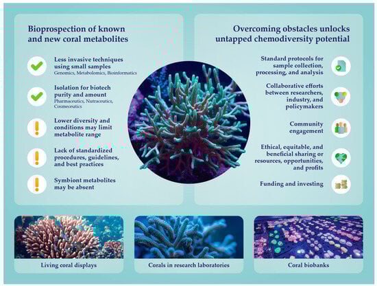 Calado R, Leal MC, Silva RXG, Borba M, Ferro A, Almeida M, Madeira D, Vieira H. Living Coral Displays, Research Laboratories, and Biobanks as Important Reservoirs of Chemodiversity with Potential for Biodiscovery. Marine Drugs. 2025; 23(2):89. https://doi.org/10.3390/md23020089