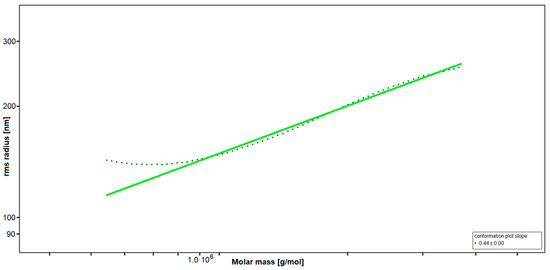 SEC-MALS (Size-Exclusion Chromatography with Multi-Angle Light Scattering) revealed a very high-molecular weight average of Mw = 3700 kDa, resulting in an average degree of polymerization (DPn) of 10,300, with an approximated average monosaccharide unit weight of 243 g/mol. To our knowledge, this is the highest molecular weight average for fucoidan yet reported [35,36]. The radius of gyration as the Z-average (Rz) was found to be 249.0 nm. The overall shape of the molecule was determined through an rms conformation plot (root mean square radius [nm] versus M [g/mol], Figure 1), displaying a slope (b) of 0.44 and thus placing the overall shape of the molecule between random coil and sphere conformation (sphere b = 0.33; random coil b = 0.5; rigid rod b = 1) [37,38]. A high degree of branching for fucoidan from LH was previously reported [33]. However, light scattering experiments suggested an oligomeric branching ‘short-chain branches’, while a conformation towards a spherical shape is indicative of polymeric branching ‘long-chain branches’ or hyper-branching, respectively [39,40].