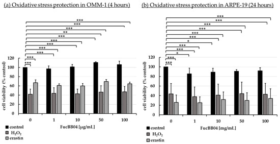 Oxidative stress assay. Human uveal melanoma cell line OMM-1 (a) and human retinal pigment epithelium cell line ARPE-19 (b) were treated with 1, 10, 50, or 100 µg/mL FucBB04 fucoidan. For oxidative stress insult, 500 µM H2O2 or 25 µM erastin for OMM-1 and 250 µM H2O2 or 20 µM erastin for ARPE-19 were applied for 4 h or 24 h, respectively. Cell survival was tested with tetrazolium bromide assay (MTT). Absorption was set into relation to the untreated control (100%). Data were normally distributed (Shapiro–Wilk test). One-sample t-test was conducted. * p ≤ 0.05, ** p ≤ 0.01, *** p ≤ 0.001 (compared to control, 0 µg/mL FucBB04 = 100%), n ≥ 5.