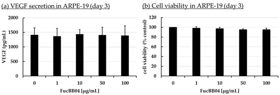 VEGF secretion and cell viability of ARPE-19. ARPE-19 cells were stimulated with 1, 10, 50, and 100 µg/mL FucBB04, respectively, for three days. Supernatant was collected for 24 h by renewing media with extracts on day 2. VEGF-A was determined in ELISA (a). MTT assay was performed at day 3 to measure cell viability (b). VEGF content in pg/mL of supernatants is shown. Data showed Gaussian distribution (Shapiro–Wilk test) and ANOVA by post hoc Dunnett’s test was performed to calculate significances. No significant changes compared to 0 µg/mL FucBB04 were detected. n = 4.