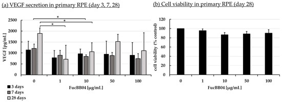 VEGF secretion and cell viability of primary RPE. Primary porcine RPE cells were stimulated with 1, 10, 50, and 100 µg/mL FucBB04 for 3, 7, and 28 days, respectively. Supernatant was collected on the individual days after changing media with extracts four hours before supernatant collection. VEGF-A was detected in ELISA (a). MTT assay was performed at day 28 to measure cell viability (b). VEGF content in pg/mL of supernatants is shown. Data showed Gaussian distribution (Shapiro–Wilk test) and ANOVA by post hoc Dunnett’s test was performed to calculate significances. * p ≤ 0.05 (compared to 0 µg/mL FucBB04 of the same day of treatment). n = 3.