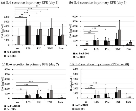 Interleukin 6 secretion. Primary porcine RPE cells were stimulated with 50 µg/mL FucBB04, and/or 1 µg/mL lipopolysaccharide (LPS), 10 µg/mL polyinosinic/polycytidylic acid (PIC), 50 ng/mL tumor necrosis factor alpha (TNF), or 10 ng/mL Pam2CSK4 (Pam) for 1 (a), 3 (b), 7 (c), and 28 days (d). Supernatants were collected and IL-6 was determined in ELISA. Data showed Gaussian distribution (Shapiro–Wilk test) and ANOVA by post hoc Dunnett’s test was performed to calculate significances. * p ≤ 0.05, ** p ≤ 0.01, *** p ≤ 0.001 (compared to co, no FucBB04); + p ≤ 0.05 (compared to stress control LPS, PIC, TNF or Pam, no FucBB04); co = control, n ≥ 3.