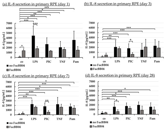 Interleukin 8 secretion. Porcine RPE cells were stimulated with 50 µg/mL FucBB04, and/or 1 µg/mL lipopolysaccharide (LPS), 10 µg/mL polyinosinic/polycytidylic acid (PIC), 50 ng/mL tumor necrosis factor alpha (TNF), or 10 ng/mL Pam2CSK4 (Pam) for 1 (a), 3 (b), 7 (c), and 28 days (d). Supernatants were collected and IL-8 was determined in ELISA. Data showed Gaussian distribution (Shapiro–Wilk test) and ANOVA by post hoc Dunnett’s test was performed to calculate significances. * p ≤ 0.05, ** p ≤ 0.01, *** p ≤ 0.001 (compared to co, no FucBB04); + p ≤ 0.05, ++ p ≤ 0.01, +++ p ≤ 0.001 (compared to stress control LPS, PIC, TNF or Pam, no FucBB04); co = control, n ≥ 3.