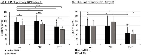 The manifestation of a cell barrier is an important task of RPE, establishing the outer blood–retina barrier [45]. The influence of FucBB04 and pro-inflammatory agents on RPE barrier function was tested. Primary porcine RPE were cultivated on transwell plates. Immediately before treatment (day 0), transepithelial electrical resistance (TEER) was measured, and cells were treated with 50 µg/mL FucBB04 and/or 10 µg/mL PIC or 50 ng/mL tumor necrosis factor alpha (TNF). PIC was chosen regarding possible protective effects of fucoidans (Section 2.4 [43]) and TNF as a known barrier-reducing agent in the RPE [7,46]. After 1 and 3 days of stimulation, TEER was measured again and set in relation to day 0 values in percent (Figure 7). Significances were calculated compared to control with no FucBB04, to day 0 values of the same well, and to stress controls PIC or TNF with no FucBB04.