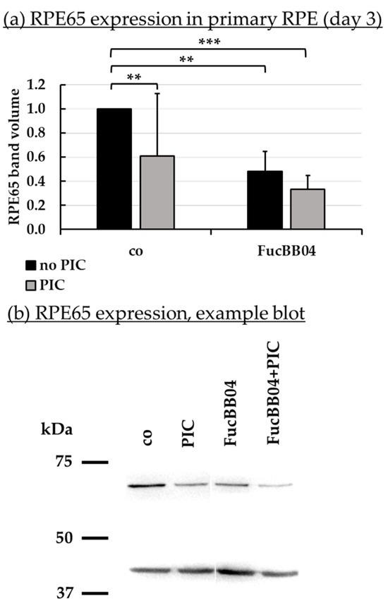 RPE65 protein expression. Primary porcine RPE cells were treated with 50 µg/mL FucBB04 and/or 10 µg/mL polyinosinic/polycytidylic acid (PIC) for three days. RPE65 expression was determined in Western blot (exemplary blot in (b)). β-actin (48 kDa) expression was used for normalization. Band volumes were calculated in TotalLab (a) in relation to untreated control. Data were normally distributed and one-sample t-test was conducted. ** p ≤ 0.01, *** p ≤ 0.001 (compared to co, no PIC); co = control, n = 5.