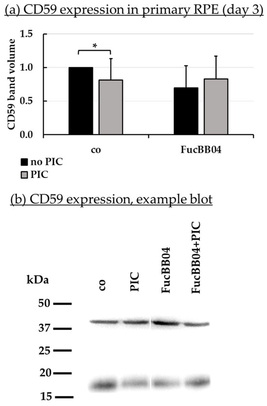 Further tasks of RPE cells involve recycling of visual pigments with RPE65 as an important enzyme [47], and the regulation of the complement system on the basolateral site by expression of CD59 [48]. Protein expression of RPE65 (Figure 8) and CD59 (Figure 9) in primary RPE was tested by Western blotting. RPE were stimulated with 50 µg/mL FucBB04 and/or 10 µg/mL PIC for three days. Band volumes were evaluated and set into relation to control without PIC. Example blots are shown in Figure 8b and Figure 9b.