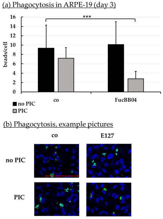 Phagocytosis of ARPE-19. ARPE-19 cells were stimulated with 50 µg/mL FucBB04 and/or 10 µg/mL polyinosinic/polycytidylic acid (PIC) for three days. Fluorescence-labeled beads opsonized with photoreceptor outer segments were applied to the cells (green dots, b). Fluoromount-G™ and 4′,6-diamidino-2-phenylindol (DAPI) was used to label cell nuclei (blue circles, b). Immunofluorescence photos were taken by Imager M2 (64× magnification, red scale bar = 100 µm). Nuclei number and beads were counted. Beads were calculated relatively to cell nuclei (a). Shapiro–Wilk test showed Gaussian distribution. Data were normally distributed and one-sample t-test was conducted. *** p ≤ 0.001 (compared to control, no PIC), co = control, n = 15.