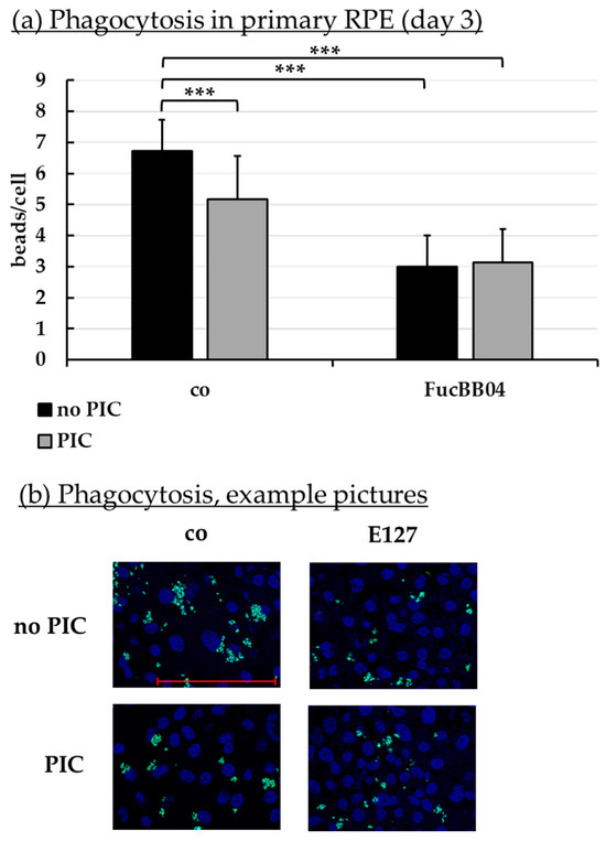 Phagocytosis of RPE. Primary porcine RPE cells were stimulated with 50 µg/mL FucBB04 and/or 10 µg/mL polyinosinic/polycytidylic acid (PIC) for three days. Fluorescence-labeled beads opsonized with photoreceptor outer segments were applied to the cells (green dots, b). Fluoromount-G™ and 4′,6-diamidino-2-phenylindol (DAPI) was used to label cell nuclei (blue circles, b). Immunofluorescence photos were taken by Imager M2 (64× magnification, red scale bar = 100 µm). Nuclei number and beads were counted. Beads were calculated relatively to cell nuclei (a). Shapiro–Wilk test showed Gaussian distribution. Data were normally distributed and one-sample t-test was conducted. *** p ≤ 0.001 (compared to control, no PIC), co = control, n = 15.