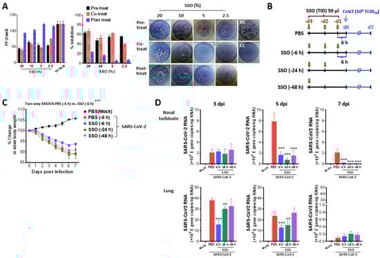 SSO pre-treatment inhibits SARS-CoV-2 replication and ameliorates morbidity in hamster infection model. (A) Inhibition of SARS-CoV-2 production by pre- and co-treatment of SSO. Vero E6 cells plated in a 24-well plate were pretreated with SSO, treated simultaneously with SSO during SARS-CoV-2 infection, or treated with SSO after virus infection. SARS-CoV-2 proliferation was assessed based on the number of plaques formed. Representative plaque images were obtained from Vero E6 cells treated with SSO. (B) Experimental scheme. Syrian hamsters were pretreated with SSO one time a day for 3 days. Pre-administration of SSO was completed 6, 24, and 48 h before SARS-CoV-2 infection, and SSO-pre-treated hamsters were monitored for changes in body weight for 7 days after virus infection. (C) Changes in body weight of SSO-pre-treated hamsters after SARS-CoV-2 infection. Changes in body weight of SSO-pre-treated hamsters were daily monitored for 7 days after SARS-CoV-2 infection. (D) SARS-CoV-2 burden in the lung tissues of SSO-pre-treated hamsters. Viral burden in the lung tissues of SSO-pre-treated hamsters was determined by E gene-targeted real-time qRT-PCR using total RNA extracted from tissues at 3, 5, and 7 dpi. The viral RNA load was expressed by SARS-CoV-2 RNA copy number per nanogram of total RNA. The graphs indicate the mean ± SEM of each group (n = 5), and results are representative of one out of at least two individual experiments with five hamsters per group. The body weight data were statistically analyzed using a two-way ANOVA. Statistical significance is indicated as * p < 0.05, ** p < 0.01, *** p < 0.001, compared to the PBS-treated group, using a two-tailed unpaired t-test.