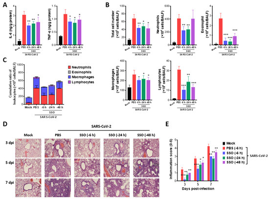 SSO pre-treatment attenuates lung inflammation in SARS-CoV-2-infected hamsters. (A) Secreted levels of cytokines in BALF fluid of SSO-pre-treated hamsters. The production of IL-6 and TNF-α was measured by ELISA at 3 days after SARS-CoV-2 infection using BALF fluid harvested from SSO-pre-treated hamsters. (B) The number of BALF leukocyte subpopulations in SSO-pre-treated hamsters. (C) Cumulative cell number of BALF leukocyte subpopulations in BALF. The leukocytes in BALF were assessed by cytospinning and subsequent Wright–Giemsa staining 3 days after SARS-CoV-2 infection. (D) Histopathological pictures of lung tissue derived from SSO-pre-treated-hamsters after SARS-CoV-2 infection. Representative H&E-stained lung sections derived from SSO-pre-treated hamsters were examined at 3, 5, and 7 dpi. Images are representative of sections (200×) from at least 5 hamsters. Represented photomicrographs show inflamed perivascular and peribronchial areas. (E) Quantitative analyses of lung inflammation. Inflammation was blind scored 3, 5, and 7 days after SARS-CoV-2 infection. The graphs indicate the mean ± SEM of each group (n = 5), and results are representative of one out of at least two individual experiments with five hamsters per group. Statistical significance is indicated as * p < 0.05, ** p < 0.01, *** p < 0.001, compared to the PBS-treated group, using a two-tailed unpaired t-test.