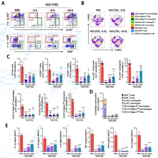 Given that SSO pre-treatment suppresses IAV-induced mortality, clinical symptoms, and viral replication, we next examined its effect on pulmonary inflammation following IAV infection. On day 5 post-infection, we analyzed the infiltration of inflammatory immune cells, specifically Ly-6C⁺ monocytes and Ly-6G⁺ neutrophils, in the BALF. The results indicated that animals pre-treated with SSO closer to the time of infection exhibited lower levels of these immune cells in the BALF (Figure 4A). Similar trends were observed for CD4⁺ and CD8⁺ T cells, with the group treated with SSO up to 2 h before infection showing the lowest levels of all these immune cells. In contrast, animals treated with SSO up to 24 h before infection exhibited levels of Ly-6C⁺ monocytes, Ly-6G⁺ neutrophils, CD4⁺ T cells, and CD8⁺ T cells comparable to those of the PBS-treated control group. Additionally, a t-distributed Stochastic Neighbor Embedding (t-SNE) map illustrating the distribution of myeloid and lymphoid cells in the BALF revealed that CD11c⁺Siglec-Fhi macrophages constituted the majority of infiltrating immune cells (Figure 4B). However, the frequency of CD11c⁺Siglec-Fhi macrophages was lower in the SSO-treated groups compared to the control group. SSO pre-treatment significantly inhibited the infiltration of Ly-6C⁺ monocytes and Ly-6G⁺ neutrophils, with the most substantial reduction observed when SSO was administered closer to the time of infection. Quantification of total myeloid and lymphoid cell counts in the BALF further confirmed that SSO pre-treatment markedly suppressed immune cell infiltration (Figure 4C). Notably, animals treated with SSO 2 h before infection exhibited the lowest levels of both myeloid and lymphoid cell infiltration. Similarly, cumulative analysis showed that the 2 h SSO pre-treatment group had the lowest overall infiltration levels (Figure 4D). The group treated with SSO up to 6 h before IAV infection also demonstrated significant suppression of immune cell infiltration, though to a lesser extent than the 2 h group.