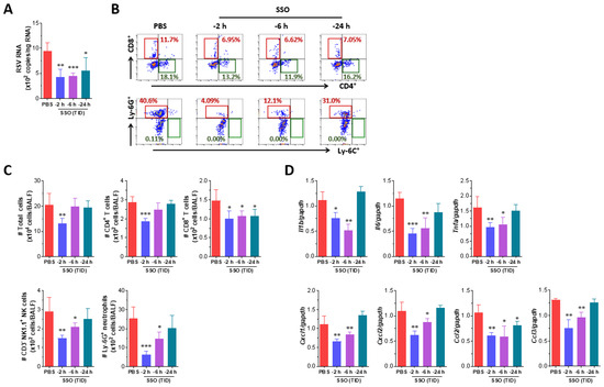 RSV is a respiratory pathogen known to cause severe pulmonary diseases, particularly in infants and older adults [43,44]. In the post-COVID-19 era, concerns over RSV spread have increased following the global outbreak of SARS-CoV-2 [45]. Given that SSO pre-treatment suppresses SARS-CoV-2- and IAV-induced pulmonary inflammation, we investigated its efficacy in mitigating RSV-induced pulmonary inflammation. The experimental design for SSO pre-treatment followed the same structure as that used for IAV infection, and viral loads in lung tissue were measured following RSV infection. The results showed that RSV levels in the lungs were lower in animals pre-treated with SSO compared to the control group treated with PBS up to 2 h before infection (Figure 5A). Notably, animals receiving SSO closer to the time of infection exhibited further reductions in viral load. We next analyzed the infiltration of inflammatory immune cells, including Ly-6C⁺ monocytes, Ly-6G⁺ neutrophils, CD4⁺ T cells, and CD8⁺ T cells, into the BALF following RSV infection. While RSV infection induced minimal infiltration of Ly-6C⁺ monocytes, Ly-6G⁺ neutrophil infiltration increased significantly in the PBS-treated control group (Figure 5B). In contrast, SSO pre-treatment effectively suppressed Ly-6G⁺ neutrophil infiltration, with the most substantial reduction observed in the groups treated with SSO up to 2 or 6 h prior to RSV infection. Animals treated up to 24 h before infection exhibited only modest suppression of neutrophil infiltration. Similarly, animals pre-treated with SSO up to 2 or 6 h before RSV infection showed reduced infiltration of CD4⁺ and CD8⁺ T cells. Quantification of total immune cell counts in the BALF confirmed that SSO pre-treatment significantly inhibited inflammatory immune cell infiltration, with the strongest effect observed when SSO was administered closer to the time of infection (Figure 5C). Specifically, the 2-h and 6-h SSO pre-treatment groups contained a significantly lower total number of Ly-6G⁺ neutrophils in the BALF compared to the PBS-treated control group. Finally, we assessed the progression of pulmonary inflammation by analyzing the expression of inflammatory cytokines in lung tissue following RSV infection. As expected, animals treated with SSO up to 2 or 6 h before RSV infection exhibited lower levels of inflammatory cytokine expression compared to the control group (Figure 5D). In contrast, animals treated up to 24 h before infection did not show a significant reduction in cytokine expression. These findings indicate that intranasal administration of SSO at least 6 h before RSV infection suppresses viral replication and mitigates pulmonary inflammation. SSO pre-treatment, therefore, holds potential as an effective preventive strategy against RSV-induced pulmonary disease.
