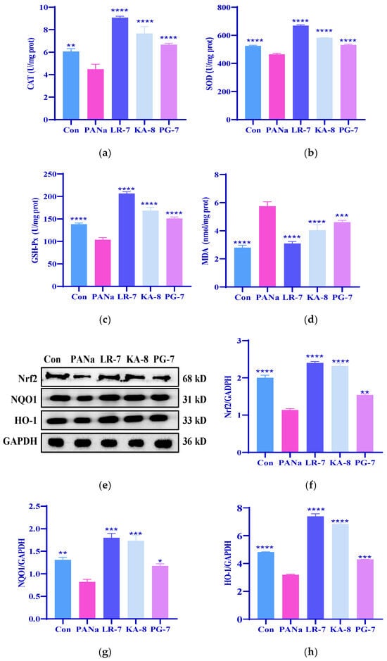 Effects of LR-7, KA-8, and PG-7 on the antioxidant capacity of HepG2 cells. The levels of CAT (a), SOD (b), GSH-Px (c), MDA (d), Nrf2 (e,f), NQO1 (e,g), and HO-1 (e,h) in HepG2 cells were measured. Con: normal control; PANa: HepG2 was treated with 350 µM PANa for 24 h. HepG2 was incubated with 100 µM KA-8 (KA-8 group), LR-7 (LR-7 group), and PG-7 (PG-7 group) for 4 h, followed by 350 µM PANa treatment for 24 h. *, **, ***, and **** represent p < 0.05, <0.01, <0.001, and <0.0001 compared with the PANa group, respectively.