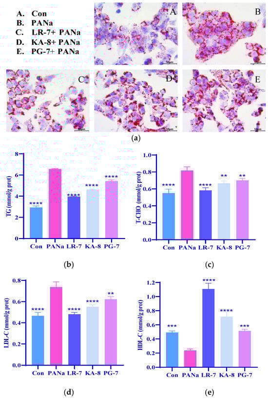 Effects of LR-7, KA-8, and PG-7 on the fat accumulation ((a), 200×) and levels of TG (b), TCHO (c), LDL-C (d), and HDL-C (e) in the HepG2 cells. Con: normal control; PANa: HepG2 was treated with 350 µM PANa for 24 h. HepG2 was incubated with 100 µM KA-8 (KA-8 group), LR-7 (LR-7 group), and PG-7 (PG-7 group) for 4 h, followed by 350 µM PANa treatment for 24 h. **, ***, and **** represent p < 0.01, <0.001, and <0.0001 compared with the PANa group, respectively.