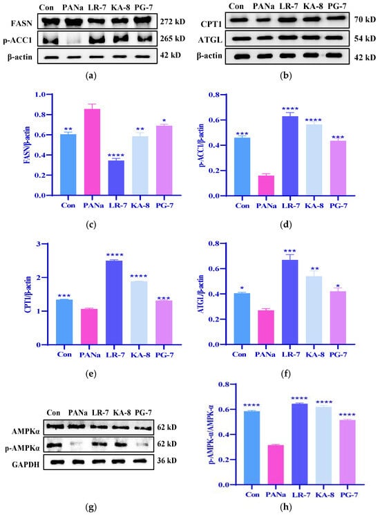 Effects of LR-7, KA-8, and PG-7 on the lipid metabolism in PANa-induced HepG2 cells. The expression of FANS, p-ACC1, CPT1, ATGL, and AMPKα were evaluated (a,b,g). The levels of FASN (c), p-ACC1 (d), CPT1 (e), ATGL (f), and p-AMPKα (h) were analyzed in PANa-stimulated HepG2. Con: normal control; PANa: HepG2 was treated with 350 µM PANa for 24 h. HepG2 was incubated with 100 µM KA-8 (KA-8 group), LR-7 (LR-7 group), and PG-7 (PG-7 group) for 4 h, followed by 350 µM PANa treatment for 24 h. *, **, ***, and **** represent p < 0.05, <0.01, <0.001, and <0.0001 compared with the PANa group, respectively.