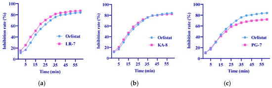 Inhibition of LR-7 (a), KA-8 (b), and PG-7 (c) on pancreatic lipase activity.