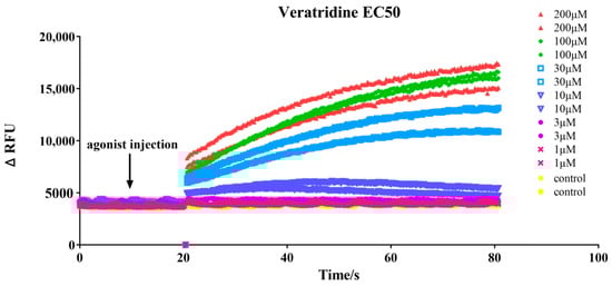 In the inhibition mode, veratridine is added after the test compounds to assess their inhibitory effects on sodium channel opening. Therefore, its concentration needs to be optimized. Real-time fluorescence changes induced by veratridine across a concentration range of 0–200 μM are shown in Figure 2. As the concentration of veratridine increased, the fluorescence intensity rose accordingly, reaching a plateau at 100 μM. A concentration of 30 μM, corresponding to approximately 80% of the maximum fluorescence signal, was selected as the optimal working concentration. At this level, the fluorescence signal was sufficiently strong and could exhibit sharp changes, making it ideal for indicating the inhibitory effects.