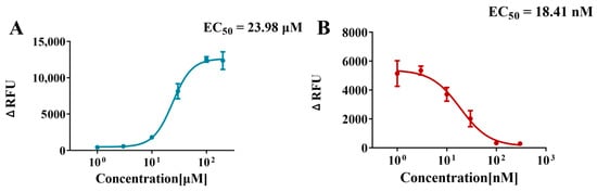 Firstly, the feasibility of the method in both agonist and inhibitor modes was confirmed using a well-known hNav1.1 channel agonist (veratridine) and inhibitor (tetrodotoxin, TTX), respectively, which served as positive controls for subsequent compound testing. As shown in Figure 2 and Figure 3A, the fluorescence intensity increased significantly as the veratridine concentration was gradually raised from 0 μM to 200 μM. The EC50 value for veratridine was obtained from the concentration–response curve to be approximately 24 μM, verifying the feasibility of the method in agonist mode.