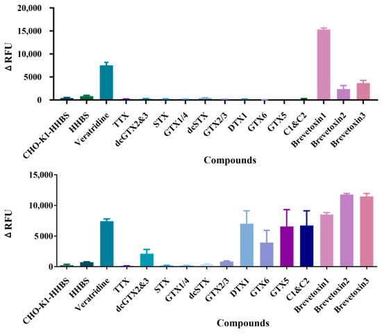 HAM’S/F-12 medium and penicillin–streptomycin solution were obtained from Hyclone (Logan, UT, USA), while veratridine was sourced from APExBIO (Houston, TX, USA). Fetal bovine serum (FBS), 0.25% Trypsin-EDTA, and Hank’s Balanced Salt Solution with 20 mM HEPES Buffer (HHBS) were supplied by Gibco (New York, NY, USA). Hygromycin B was purchased from Amresco (Solon, OH, USA), and phosphate-buffered saline (PBS) from Takara (Shiga, Japan). Poly-L-lysine solution (PLL) and DMSO were obtained from Sigma (Saint Louis, MO, USA). The fluorescence membrane potential assay kit (Screen Quest Membrane Potential Assay Kit Red Fluorescence) was obtained from AAT Bioquest (Pleasanton, CA, USA). Zeocin and blasticidin were purchased by Solarbio (Beijing Solarbio Science & Technology Co., Ltd., Beijing, China). Dimethyl Sulfoxide (DMSO), Sodium Chloride (NaCl), KCl, Ethylene Glycol Bis(2-aminoethylether)-N,N,N′,N′-tetra acetic acid (EGTA), MgCl2·6H2O, D-Glucose and CaCl2·2H2O were both obtained from Sigma (Saint Louis, MO, USA). Tetrodotoxin (purity ≥ 99%) was provided by Zhejiang Kangte Biotechnology (Hangzhou, China). Brevetoxin 1, 2, and 3 (purity ≥ 95%) were sourced from Taiwan Algal Science (Taoyuan, China). GTX1/4, GTX 2/3, GTX 5, GTX 6, DTX 1, STX, dcGTX 2&3, dcSTX, and C1&C2 were purchased from Health Canada (Ottawa, ON, Canada). All experiments utilized ultrapure water.