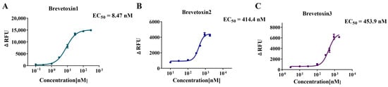 Agonist concentration–response curves and EC50 values of brevetoxin1 (A), brevetoxin2 (B), and brevetoxin3 (C). Data points represent the mean ± SE from triplicate measurements.