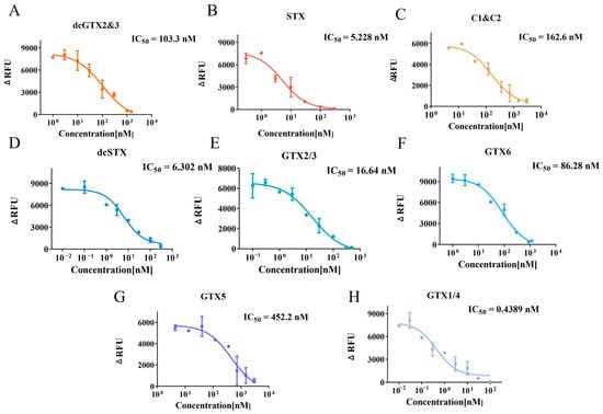 Inhibition curves and IC50 values for dcGTX2&3 (A), STX (B), C1&C2 (C), dcSTX (D), GTX2/3 (E), GTX6 (F), GTX5 (G), and GTX1/4 (H). Data points represent the mean ± SE from triplicate measurements.