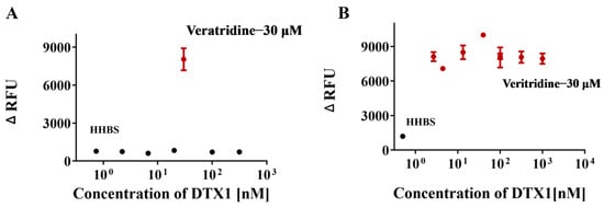 To further validate the specificity of this assay, we measured the fluorescence response of DTX1, a compound known not to interact with the hNav1.1 channel, in both agonist and inhibitor modes. In the preliminary screening mode (Figure 4), DTX1 did not exhibit any potential agonist or inhibitor activity. Further concentration–response curve analysis revealed that, in the agonist mode (Figure 7A), as the concentration of DTX1 increased, the fluorescence signal remained at baseline levels, with no significant increase even at a high concentration of 20 μM. In the inhibition mode (Figure 7B), as the concentration of DTX1 increased, the fluorescence intensity stimulated by 30 μM veratridine remained elevated and was not significantly inhibited. These observations suggest that DTX1 does not interact with the hNav1.1 channel, which is consistent with previous reports indicating that DTX1 is primarily associated with diarrhetic shellfish poisoning (DSP) rather than neurotoxicity [], thus demonstrating the selectivity and specificity of the testing platform.