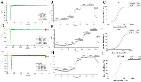 Effect of different concentrations (0.1 nM to 1000 nM) of TTX (A), dcSTX (D), and GTX1&4 (G) on hNav1.1 current signals measured by the patch-clamp technique. The currents were recorded from multiple experiments for TTX (B), dcSTX (E), and GTX1&4 (H), along with the resulting inhibition curves ((C): TTX, (F): dcSTX, (I): GTX1&4). The data points in (C,F,I) represent the mean ± SE from duplicate measurements in 2 cells.