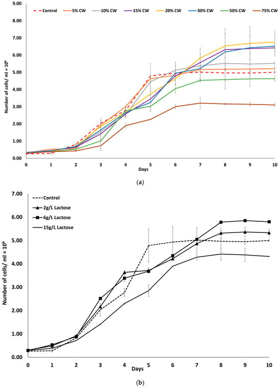 Growth rate as the number of D. tertiolecta cells in various concentrations of CW (0–75%) (a) and lactose (2 g L−1, 6 g L−1, 15 g L−1) (b). The error bars represent the standard deviation of the means, with n = 3.