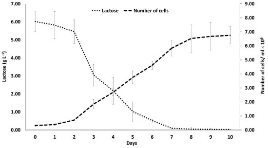 A gradual decrease in lactose in the MC over the 10-day period was observed (Figure 2). Specifically, the initial lactose concentration was 6.02 g L−1. A notable decrease occurred between the 2nd and 3rd days, during which lactose dropped to 3.05 g L−1, and by the 7th day of cultivation, the lactose content was completely depleted. Despite this, the microalgal population continued to grow steadily until day 10.