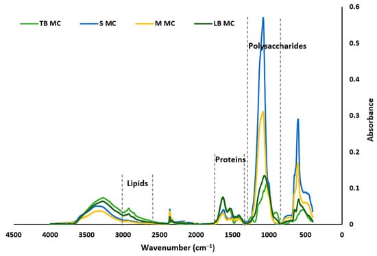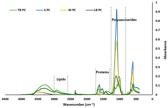An FT-IR ATR spectrometer was used to identify the various functional groups contained by the EPSs. It was observed that both types of EPSs (i.e., photoautotrophic and mixotrophic) and their fractions (tightly bound EPS, soluble EPS, a mixture of all three fragments, and loosely bound EPSs) exhibited significant similarities across all the main spectral regions (Figure 3 and Figure 4). The FT-IR spectra in the 900–1300 cm−1 region are characteristic of polysaccharide functional groups, while the region between 1500 and 1800 cm−1 is indicative of proteins, and the region between 2800 and 3000 cm−1 is associated with lipids [,]. As observed in both figures, regions characteristic for polysaccharides and proteins are prominent in all four different EPS fragments for both the PC and the MC EPSs. However, regarding lipids, only the LB-EPS and TB-EPS fractions show distinct peaks, whereas the other EPS fractions do not display any significant peaks in this range.
