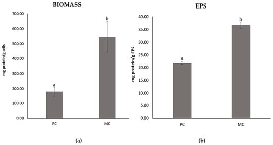 Total protein content of biomass (a) and EPSs (b). PC: photoautotrophic culture; MC: mixotrophic culture with 20% CW. Values represent the mean ± standard deviation, with n = 3. Values bearing different superscripts indicate a statistically significant difference (p ≤ 0.05).