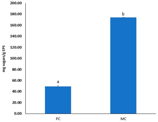 Total sugars contents of the EPSs. PC: photoautotrophic culture; MC: mixotrophic culture with 20% CW. Values represent the mean ± standard deviation, with n = 3. Values bearing different superscripts indicate a statistically significant difference (p ≤ 0.05).