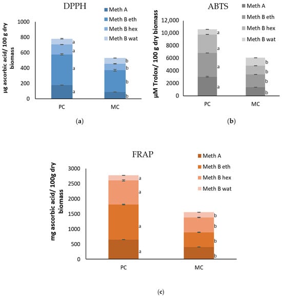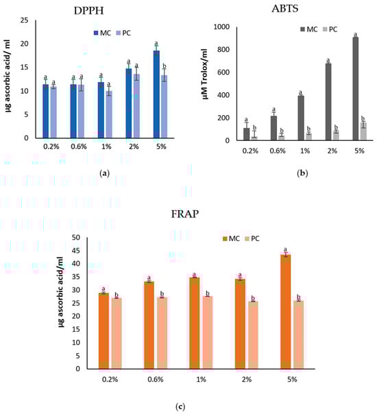 Antioxidant capacities of the biomass measured with DPPH (a), ABTS (b), and FRAP (c) assays. PC: photoautotrophic culture; MC: mixotrophic culture. Values represent the mean ± standard deviation, with n = 3. Values bearing different superscripts indicate a statistically significant difference (p ≤ 0.05).