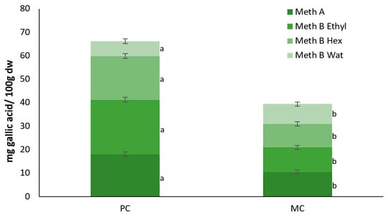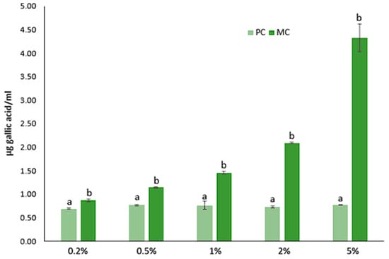 Total polyphenol contents of the biomass. PC: photoautotrophic culture; MC: mixotrophic culture. Values represent the mean ± standard deviation, with n = 3. Values bearing different superscripts indicate a statistically significant difference (p ≤ 0.05).