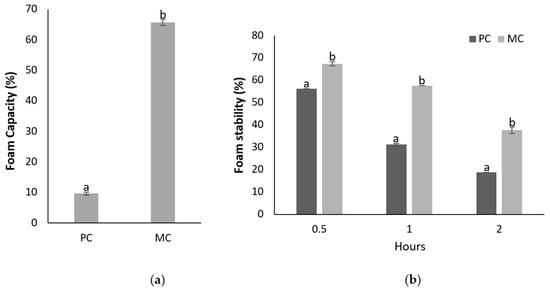 Foam capacity (a) and foam stability (b) of the EPSs expressed as a %. PC: photoautotrophic culture; MC: mixotrophic culture. Values represent the mean ± standard deviation, with n = 3. Values bearing different superscripts indicate a statistically significant difference (p ≤ 0.05).