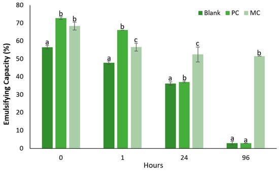 Emulsifying capacity and emulsifying stability of the EPSs expressed as a %. PC: photoautotrophic culture; MC: mixotrophic culture. Values represent the means ± standard deviation, with n = 3. Values bearing different superscripts indicate a statistically significant difference (p ≤ 0.05).