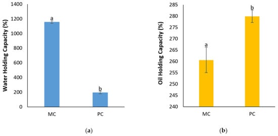 Water holding capacity (a) and oil holding capacity (b) of the EPSs expressed as a %. PC: photoautotrophic culture; MC: mixotrophic culture. Values represent the mean ± standard deviation, with n = 3. Values bearing different superscripts indicate a statistically significant difference (p ≤ 0.05).