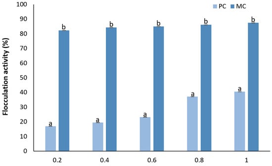 Flocculation capability of the EPSs expressed as a % for the five different concentrations. PC: photoautotrophic culture; MC: mixotrophic culture. Values represent the mean ± standard deviation, with n = 3. Values bearing different superscripts indicate a statistically significant difference (p ≤ 0.05).