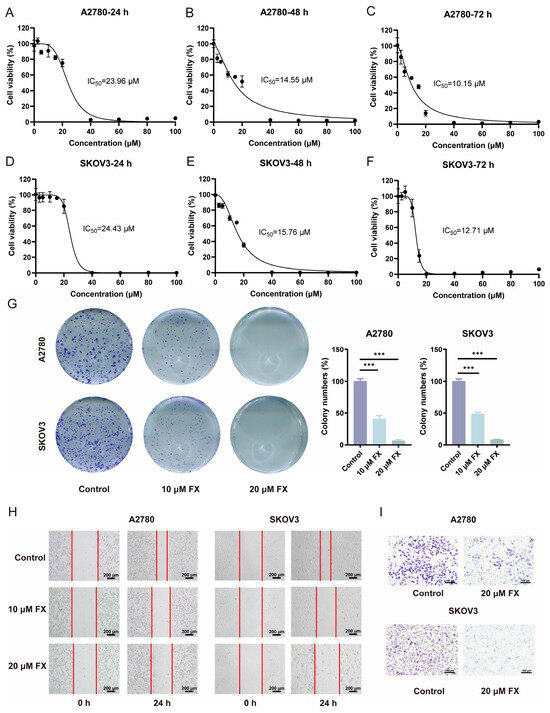 FX inhibits the proliferation and metastasis of A2780 and SKOV3 cells. (A–F) FX caused a decrease in the viability of A2780 (A–C) and SKOV3 (D–F) cells. Varied concentrations of FX (0, 2.5, 5, 10, 15, 20, 40, 60, 80, and 100 μM) were administered to the cells for 24, 48, and 72 h. (G) FX suppressed the proliferation of A2780 and SKOV3 cellular colonies. (H) The migration abilities of A2780 and SKOV3 cells with FX were assessed by wound healing assays. (I) The invasion abilities of A2780 and SKOV3 cells with FX were evaluated by transwell assays. The results are shown as the average value plus or minus the standard error of the mean (SEM), n = 3. *** p < 0.001, when compared to the control group.