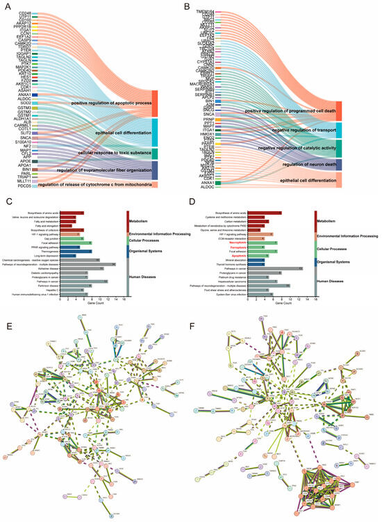 To clarify the functional roles and molecular mechanisms of FX treatment in OC, we conducted TMT-based LC-MS/MS analysis on precipitates isolated from A2780 cells. These cells were treated with either a control medium or media supplemented with different concentrations of FX (10 μM or 20 μM). We performed the Gene Ontology (GO) enrichment analysis to understand protein expression changes. As expected, the GO analysis indicated that treatment with 10 μM FX impacted Mitochondrial membrane potential (MMP) and the regulation of reactive oxygen species (ROS), suggesting FX plays a role in modulating mitochondrial homeostasis in ovarian cancer cells (Figure 2A). Treatment with 20 μM FX further influenced programmed cell death pathways, suggesting that FX may induce cell death in OC cells through the regulation of programmed cell death (Figure 2B). Moreover, the Kyoto Encyclopedia of Genes and Genomes (KEGG) analysis showed that different concentrations of FX therapy were connected with specific biological functions. Specifically, treatment with 10 μM FX primarily influenced pathways related to reactive oxygen species, while treatment with 20 μM FX predominantly affected pathways associated with ferroptosis, apoptosis, and necroptosis (Figure 2C,D). A protein–protein interaction (PPI) network was generated by submitting the overlapping core target genes to the STRING database. The resulting network was imported into Cytoscape 3.7.2 for construction and visualization (Figure S2A,B). The MCODE plugin distinguished the PPI network by cluster (Figure 2E,F). These findings suggested that FX, particularly at higher concentrations, has the potential to induce diverse forms of OC cell death, offering insight into its potential application in functional foods for cancer prevention or therapy.