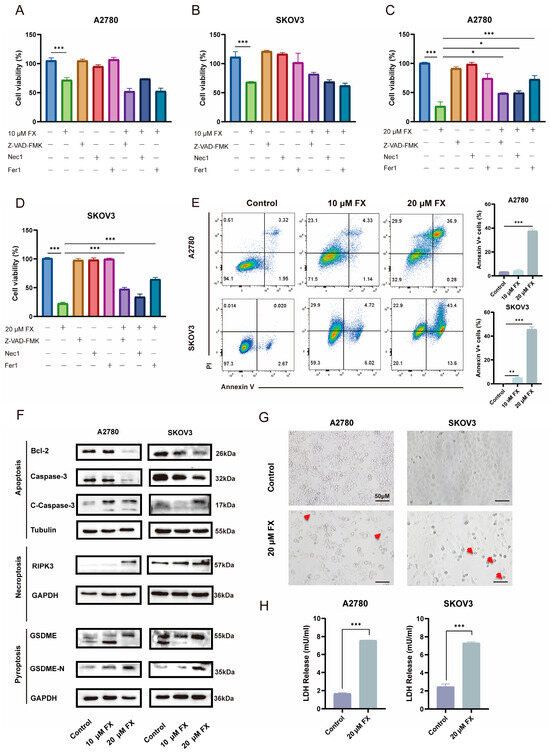 FX-induced programmed cell death in ovarian cancer cells. Inhibitors of apoptosis, ferroptosis, and necrosis co-cultured with 10 μM (A,B) FX and 20 μM (C,D) FX to detect ovarian cancer cell viability. (E) The apoptosis rate was measured by flow cytometry in A2780 and SKOV3 cells. (F) Western blotting analyses were performed in A2780 and SKOV3 cells to measure protein expression. (G) Representative photographs of pyroptotic cells are shown. Red arrows represent pyroptotic cells. (H) The release of LDH was measured using LDH detection kits. * p < 0.05, ** p < 0.01, *** p < 0.001.