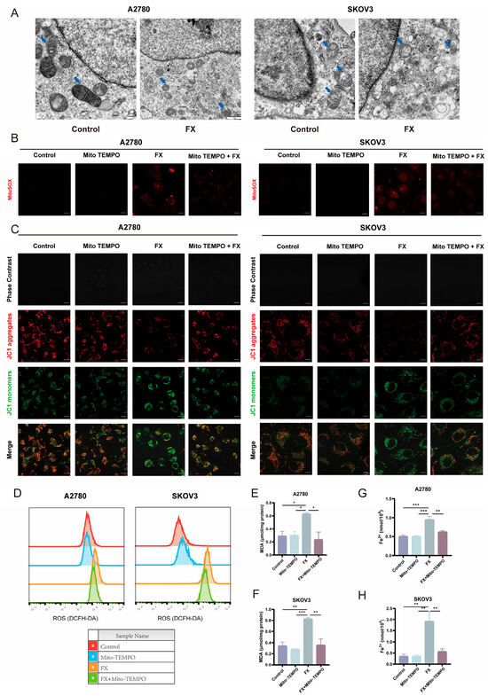 Mitochondria have a crucial function in several types of cell death, such as apoptosis [35], ferroptosis [36], pyroptosis [37], and necroptosis [38]. Mitochondria serve as crucial cellular energy sources and are central ferroptosis regulators. We assessed mitochondrial ultrastructure, mitochondrial morphology, and MMP. We utilized transmission electron microscopy (TEM) to examine mitochondrial ultrastructure (Figure 5A). FX consistently led to reduced mitochondrial size, double membrane thickness, decreased mitochondrial cristae, and outer membrane rupture in both A2780 and SKOV3 cells. Recent studies underscore the essential role of mitochondria-mediated ROS production in initiating lipid peroxidation and the subsequent ferroptosis [36,39]. Furthermore, impaired mitochondria have been identified as the primary source of ROS, a critical indicator of ferroptosis [40]. We utilized the mitochondrial ROS inhibitor Mito TEMPO to investigate the mechanism of ferroptosis induced by FX. A2780 and SKOV3 cells were treated under various experimental conditions as follows: FX group (20 μM FX), Mito TEMPO group (10 μM Mito TEMPO), and FX and Mito TEMPO group. Mitochondrial ROS was evaluated by the MitoSOX Red fluorescent probe (Figure 5B). MMP was quantified utilizing the JC-1 fluorescent probe, with the red-to-green fluorescence intensity ratio indicative of mitochondrial depolarization. Elevated ROS levels can induce the mitochondrial membrane permeability transition pore (MPT) to open, which in turn leads to a reduction in mitochondrial transmembrane potential (Δψm) [41]. Notably, both A2780 and SKOV3 cells exhibited a significant decrease in MMP following FX treatment, which was rescued by Mito TEMPO (Figure 5C). Furthermore, compared with FX treatment, treatment with Mito TEMPO; inhibited the increase in ROS levels (Figure 5D), MDA content (Figure 5E,F), and iron ion accumulation (Figure 5G,H), underscoring the role of FX in mediating the massive release of mitochondrial ROS via mitochondrial damage in ferroptosis. These findings collectively indicate that FX-induced ferroptosis is linked to ROS-mediated mitochondrial dysfunction in OC.